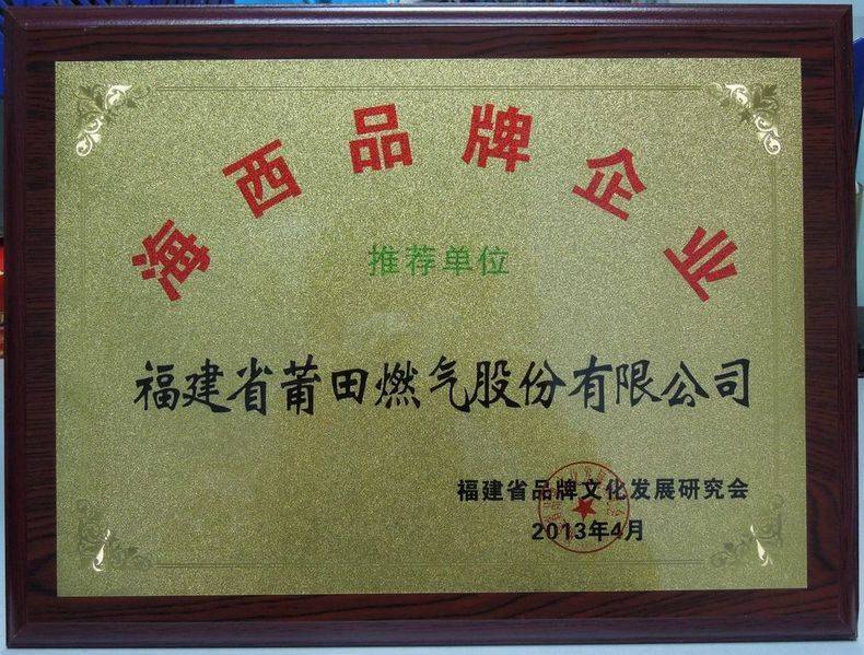 2013年04月 莆田燃氣被福建省品牌文化發展研究會推薦為 “海西品牌企業”