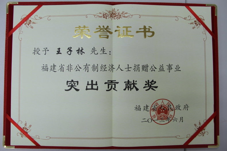2013年06月 王子林董事長榮獲“福建省非公有製經濟人士捐贈公益事業突出貢獻獎”