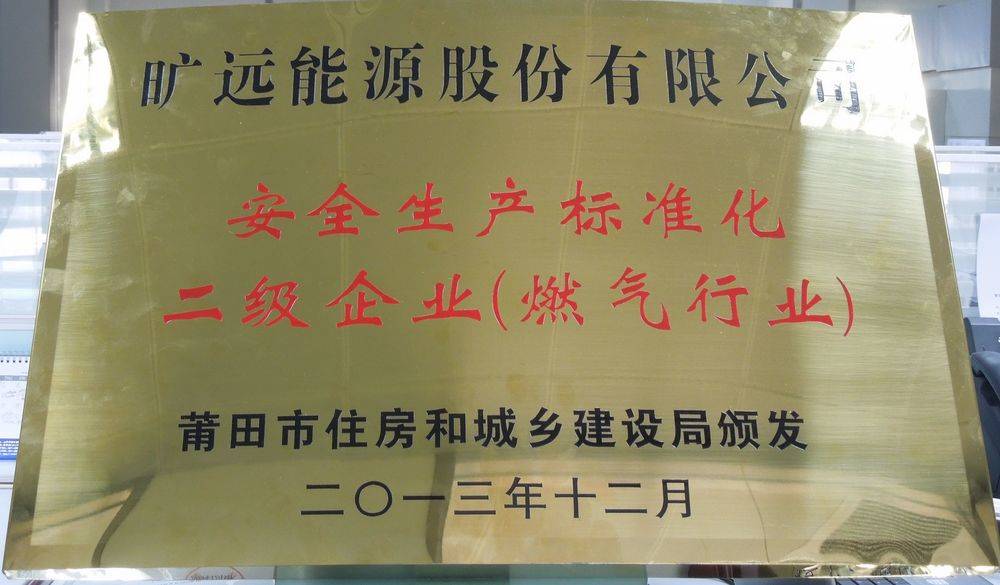2013年12月 曠遠能源被莆田市住建局評為“安全生產標準化二級企業(燃氣行業)”