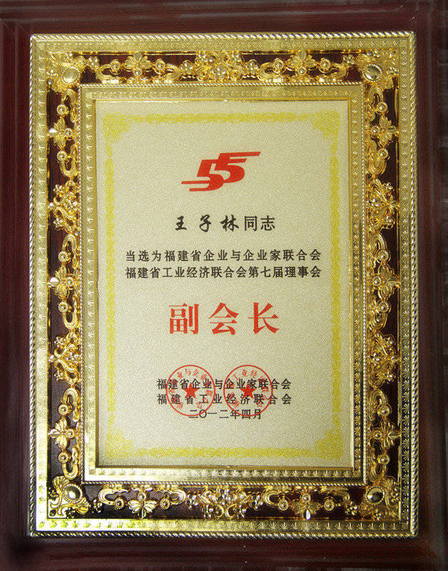 2012年04月 王子林董事長當選為福建省企業與企業家聯合會福建省工業經濟聯合會第七屆理事會副會長