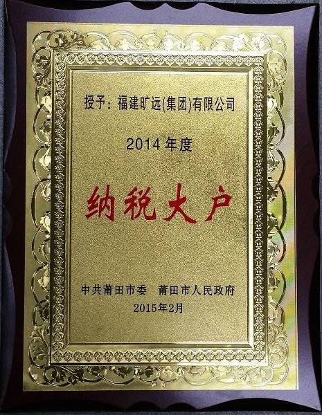 2016年01月 福建曠遠集團獲中共荔城區委、荔城區人民政府授予“二〇一五年度納稅大戶二等獎”稱號。