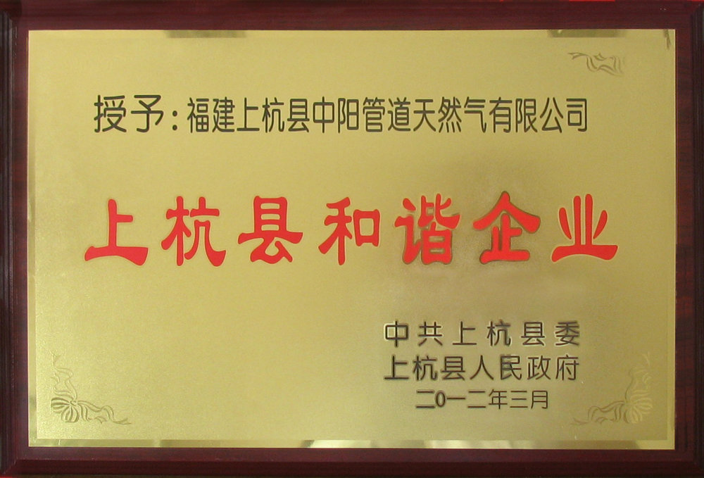 2012年03月 福建上杭縣中陽管道天然氣有限公司榮獲“上杭縣和諧企業”稱號