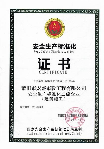 宏盛市政榮獲國家安全生產標準化三級證書