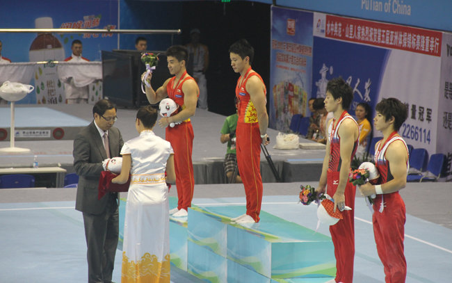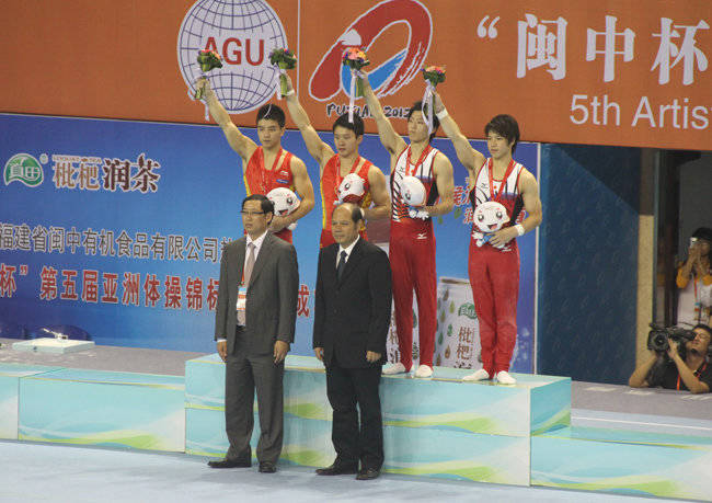 11月14日,體操亞錦賽進入第四個比賽日,經過激烈角逐,中國選手劉榕冰在男子單杠比賽中以15.900分奪得冠軍,林超攀獲得亞軍。曠遠集團董事長王子林作為特邀嘉賓,欣然上台為該項目的冠亞季軍頒發獎牌、鮮花和吉祥物。