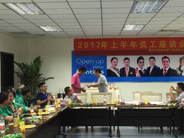 2017年7月14日晚19:30,莆田市宏盛市政工程有限公司組織召開2017年上半年度員工座談會。本次座談會旨在了解員工工作、生活情況,聽取員工對企業內部管理中的意見和建議,進一步加強與員工的溝通和交流,幫助公司改善管理、提高效率。