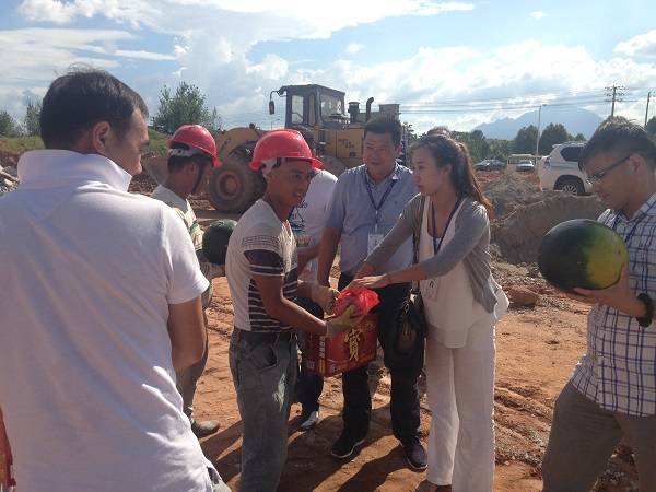 7月21日上午,總裁辦主任朱琳、宏盛市政公司總經理施偉江,分別至涵江六一路開發商“億發城”、秀嶼毓秀路公福“永和豆漿”、東海開發商“天譽首府”施(shi)工(gong)現(xian)場(chang),為(wei)班(ban)組(zu)施(shi)工(gong)人(ren)員(yuan)送(song)去(qu)關(guan)懷(huai),並(bing)在(zai)現(xian)場(chang)詳(xiang)細(xi)了(le)解(jie)施(shi)工(gong)進(jin)度(du),提(ti)醒(xing)他(ta)們(men)注(zhu)意(yi)施(shi)工(gong)安(an)全(quan)。當(dang)天(tian)下(xia)午(wu),載(zai)著(zhe)滿(man)車(che)的(de)消(xiao)暑(shu)降(jiang)溫(wen)物(wu)品(pin),集(ji)團(tuan)人(ren)力(li)資(zi)源(yuan)中(zhong)心(xin)總(zong)監(jian)吳(wu)高(gao)忠(zhong)、總裁辦主任朱琳、曠遠能源綜合部經理曹莉君先後至曠遠能源荔園分銷站、荔園加氣站、涵西加氣站、涵西分銷站、曠遠莆田衛浴城及酒店保安部、鍋爐房、廚房、洗衣房等地開展慰問,他們向冒著高溫酷暑辛勤工作的一線員工表示敬意,並囑咐他們在高溫天氣期間做好各項防護措施。