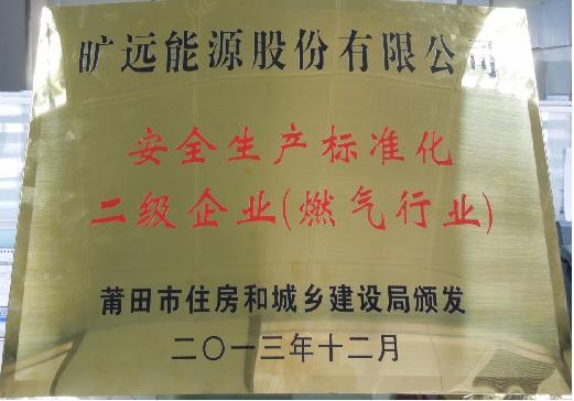 2013年12月27日,莆田市住建局正式授予曠遠能源“安全生產標準化二級企業”證書匾額,這是繼2011年曠遠能源獲燃氣企業安全生產考核A級認定後的又一安全生產殊榮。