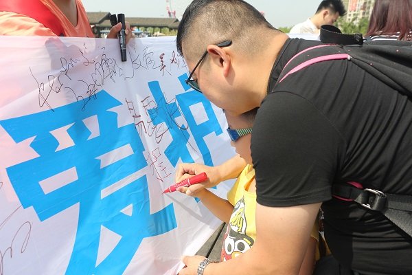 圖為市民在”愛護洋湖濕地,保護湘江母親河”橫幅上簽名
