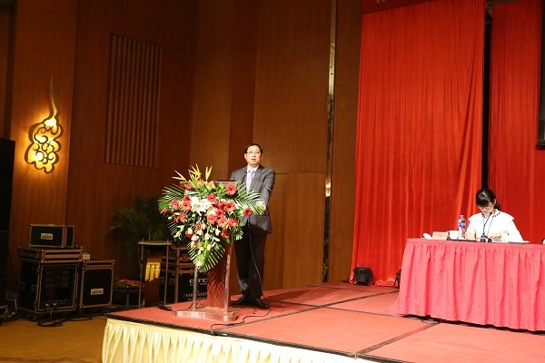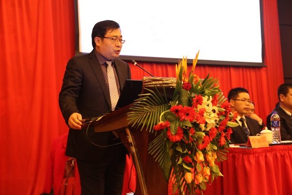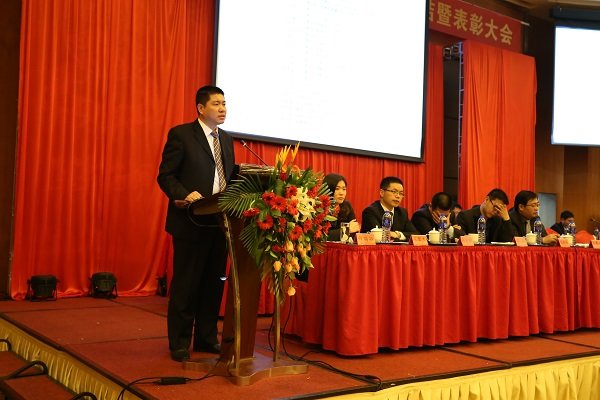 圖為曠遠集團2014年度工作總結暨表彰大會上曠遠集團總裁王子林作工作彙報