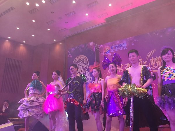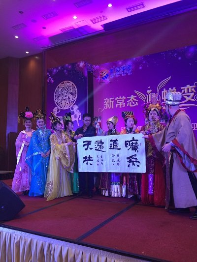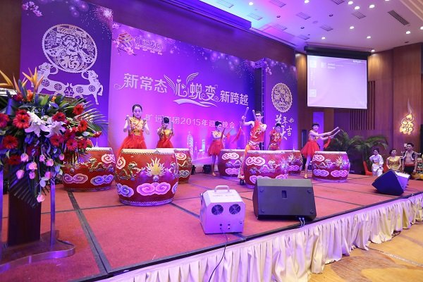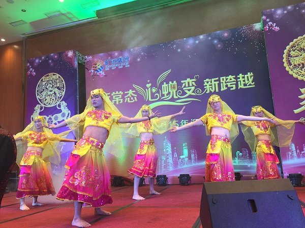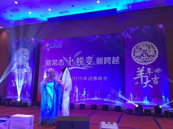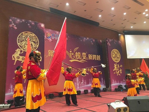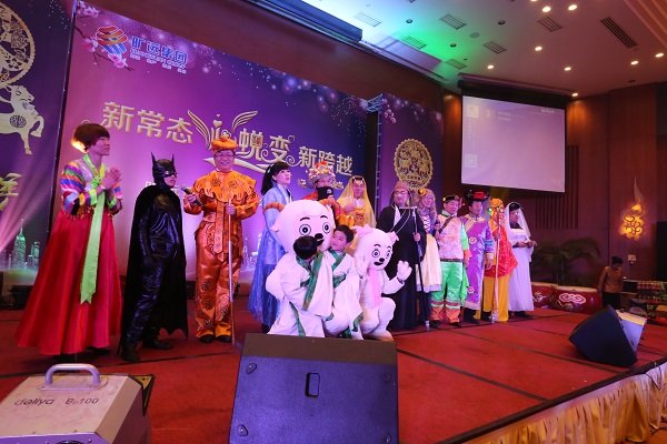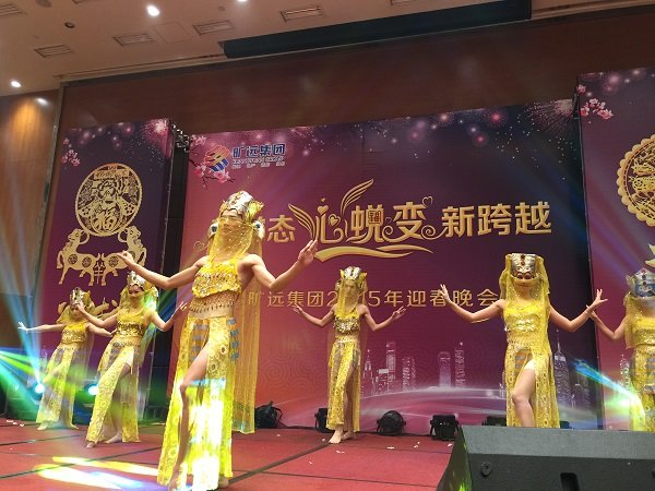 圖為曠遠集團2015年迎春晚會現場高管變裝登台拜年