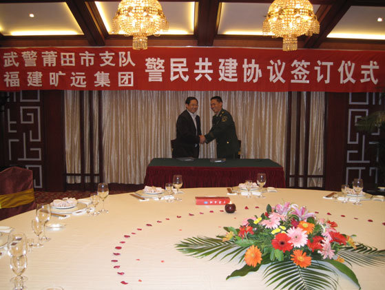 2009年11月17日(ri)晚(wan)上(shang),福(fu)建(jian)曠(kuang)遠(yuan)集(ji)團(tuan)與(yu)武(wu)警(jing)福(fu)建(jian)部(bu)隊(dui)莆(pu)田(tian)支(zhi)隊(dui)在(zai)天(tian)妃(fei)溫(wen)泉(quan)大(da)酒(jiu)店(dian)二(er)樓(lou)隆(long)重(zhong)舉(ju)行(xing)了(le)本(ben)次(ci)警(jing)民(min)共(gong)建(jian)活(huo)動(dong)的(de)啟(qi)動(dong)儀(yi)式(shi)。本(ben)次(ci)活(huo)動(dong)受(shou)到(dao)福(fu)建(jian)曠(kuang)遠(yuan)集(ji)團(tuan)、武(wu)警(jing)莆(pu)田(tian)支(zhi)隊(dui)領(ling)導(dao)的(de)高(gao)度(du)重(zhong)視(shi),福(fu)建(jian)曠(kuang)遠(yuan)集(ji)團(tuan)董(dong)事(shi)長(chang)王(wang)子(zi)林(lin)先(xian)生(sheng)與(yu)武(wu)警(jing)莆(pu)田(tian)支(zhi)隊(dui)政(zheng)委(wei)周(zhou)誌(zhi)強(qiang)先(xian)生(sheng)均(jun)出(chu)席(xi)了(le)共(gong)建(jian)活(huo)動(dong)的(de)啟(qi)動(dong)儀(yi)式(shi),並(bing)分(fen)別(bie)發(fa)表(biao)了(le)講(jiang)話(hua)。他(ta)們(men)對(dui)曠(kuang)遠(yuan)集(ji)團(tuan)和(he)武(wu)警(jing)中(zhong)隊(dui)前(qian)期(qi)的(de)工(gong)作(zuo)以(yi)及(ji)本(ben)次(ci)共(gong)建(jian)活(huo)動(dong)的(de)意(yi)義(yi)給(gei)予(yu)了(le)充(chong)分(fen)的(de)肯(ken)定(ding),希(xi)望(wang)共(gong)建(jian)雙(shuang)方(fang)積(ji)極(ji)配(pei)合(he)、搞好協調,抓住重點、講求實效,使共建活動盡快地開出花、結出果,同時相信通過這次共建活動,必將進一步鼓舞雙方互相支持與共進,共同為建設和諧社會而努力!