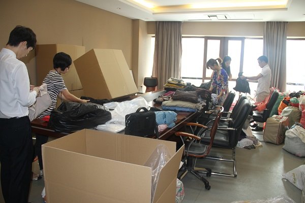 作為本次捐贈活動的主場,9月16日,在集團各公司行政人員的配合下,上千件衣物在集團9樓會議室進行整理並打包裝箱。9月17日下午,在工作人員的幫助下,近20箱衣物被送往中國郵政速遞公司,辦理相關郵寄手續後,一並寄往甘肅。