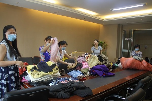 圖為員工整理捐贈衣物現場