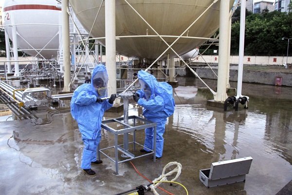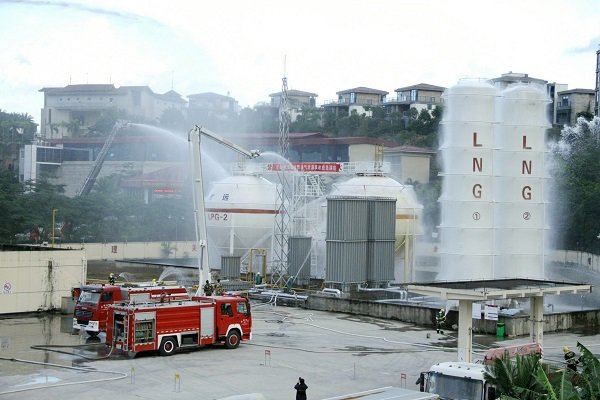 本次演練項目為: LPG1#儲罐底部出液管第一道法蘭墊片老化造成液化氣泄漏事故的應急處置。主要流程為:模擬事故發生、報警、應急啟動、人員疏散、安全警戒、消防噴淋驅散燃氣稀釋濃度、搶險堵漏及最終解除警戒等。在演練總指揮葉春總經理的指揮下,所有參演人員嚴肅認真、有條不紊地推進各個步驟,曆時一個小時後,演練圓滿完成。