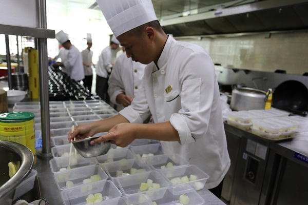 圖為酒店廚師們正認真搭配愛心便當