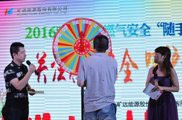 轉盤抽獎環節將活動推向了高潮,共抽取燃氣安全達人幸運獎若幹名,優勝獎20名,三等獎3名,二等獎2名,一等獎1名。期間更有熱心觀眾踴躍上台,表達了對燃氣安全的所感所想,以真實的案例為背景,對曠遠能源的優質服務表示感謝。