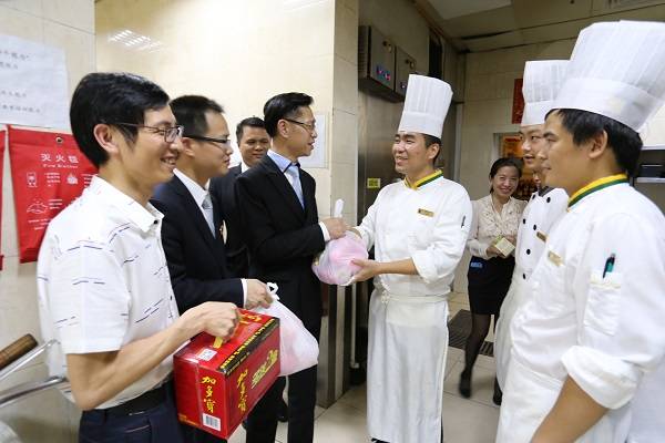 2016年8月9ri,youjiudianzongjingliwangzhibinjigebumenfuzerenzuchengdegaowenweiwenxiaozudaibiaojituanjijiudianxiangzaijiudiangaowengangweigongzuodeyuangongjinxingweiwengongzuo,xianhouzhijiudianxiyifang、鍋爐房、PA、西廚房、中廚房、日廚房、保安、員yuan工gong食shi堂tang等deng高gao溫wen崗gang位wei拜bai訪fang工gong作zuo人ren員yuan,並bing為wei他ta們men送song去qu消xiao暑shu慰wei問wen品pin,感gan謝xie員yuan工gong辛xin勤qin付fu出chu,並bing囑zhu咐fu員yuan工gong高gao溫wen作zuo業ye時shi應ying注zhu意yi操cao作zuo安an全quan和he保bao護hu措cuo施shi,做zuo好hao防fang暑shu降jiang溫wen工gong作zuo。