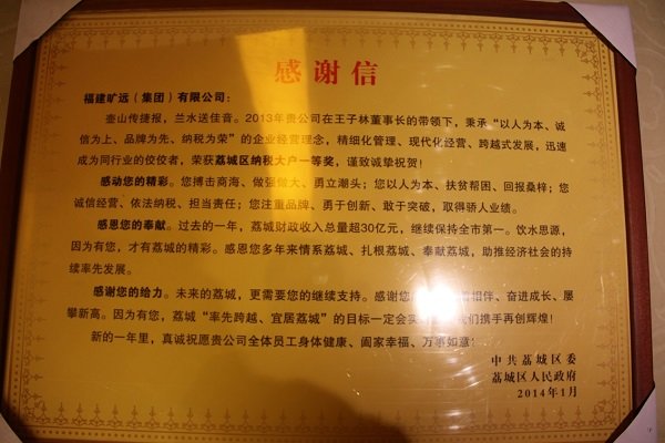 曠遠集團榮獲莆田市“2014年度納稅大戶”稱號