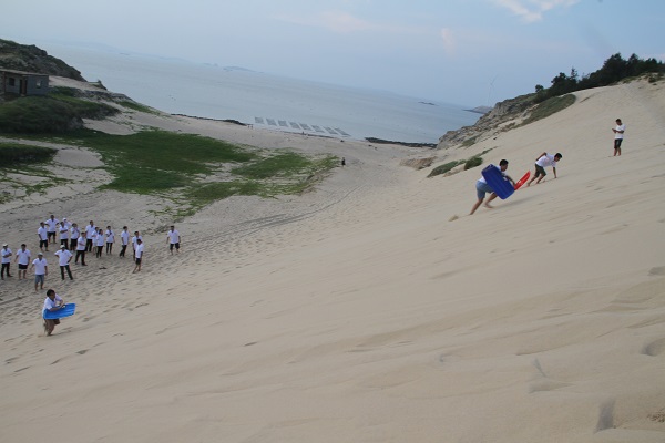 22日下午13:30,全體人員在莆田辦公樓一樓集合後,統一乘坐大巴前往石城碼頭,搭乘輪船至南日島。當天下午15:30到dao達da南nan日ri島dao後hou,經jing過guo一yi番fan修xiu整zheng,全quan體ti人ren員yuan即ji刻ke前qian往wang南nan日ri島dao皇huang帝di山shan沙sha灘tan。活huo動dong首shou先xian將jiang人ren員yuan分fen成cheng四si組zu,推tui選xuan出chu小xiao組zu組zu長chang後hou,各ge隊dui分fen別bie為wei自zi己ji所suo在zai隊dui伍wu取qu隊dui名ming,分fen別bie為wei蛟jiao龍long隊dui、海龍隊、海神隊、風車隊。隨後,隊長帶領隊員選取副隊長,並為團隊取口號,進行了團隊風采展示。各隊儼然進入了“戰鬥”狀態,迫不及待地趕往沙丘開展滑沙比賽。