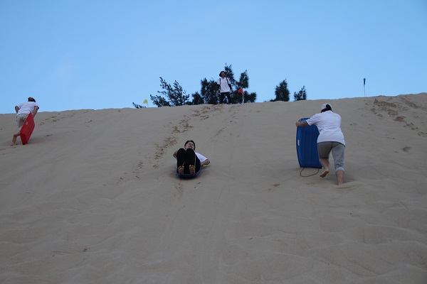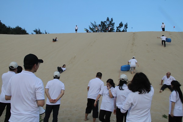 作為團建活動的第一個項目,滑沙比賽雖看似簡單,其實不易。比賽規則為:在zai陡dou峭qiao的de沙sha丘qiu上shang,每mei隊dui的de前qian一yi名ming隊dui員yuan從cong沙sha嶺ling乘cheng坐zuo滑hua沙sha板ban下xia滑hua至zhi山shan腳jiao,後hou一yi名ming成cheng員yuan取qu走zou滑hua沙sha板ban後hou爬pa上shang沙sha丘qiu再zai下xia滑hua,全quan隊dui成cheng員yuan依yi次ci完wan成cheng接jie力li,最zui先xian完wan成cheng的de隊dui伍wu獲huo勝sheng。為wei了le團tuan隊dui榮rong譽yu,隊dui員yuan們men不bu顧gu沙sha丘qiu上shang的de阻zu擾rao,奮fen力li拚pin搏bo,最zui終zhong,蛟jiao龍long隊dui在zai該gai項xiang目mu中zhong取qu得de勝sheng利li。精jing彩cai的de比bi賽sai使shi得de大da家jia意yi猶you未wei盡jin,於yu是shi現xian場chang臨lin時shi加jia賽sai,由you每mei隊dui副fu隊dui長chang代dai表biao所suo在zai隊dui伍wu進jin行xing比bi拚pin,在zai該gai輪lun比bi拚pin中zhong,風feng車che隊dui勝sheng出chu。