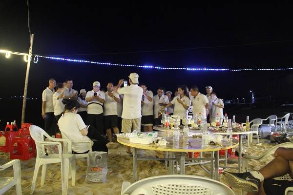 滑沙比賽結束後,所有成員欣賞著海邊的日落與晚霞,並開始著手生火、備bei材cai,準zhun備bei晚wan餐can。其qi中zhong,海hai神shen隊dui在zai生sheng火huo項xiang目mu中zhong以yi明ming顯xian的de優you勢shi,快kuai於yu其qi他ta隊dui伍wu首shou先xian烤kao起qi了le食shi材cai。每mei隊dui隊dui員yuan們men一yi邊bian動dong手shou燒shao烤kao,一yi邊bian準zhun備bei食shi材cai,場chang麵mian好hao不bu熱re鬧nao。期qi間jian,開kai懷huai暢chang飲yin、誰是大胃王等趣味比拚,為晚餐增添了諸多歡笑。在合唱的歌聲中,當天活動圓滿結束。